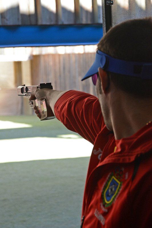 Trinta disparos de precisión e trinta disparos rápidos dunha pistola de calibre 9 mm. Lévase a cabo en obxectivos situados a 25m.