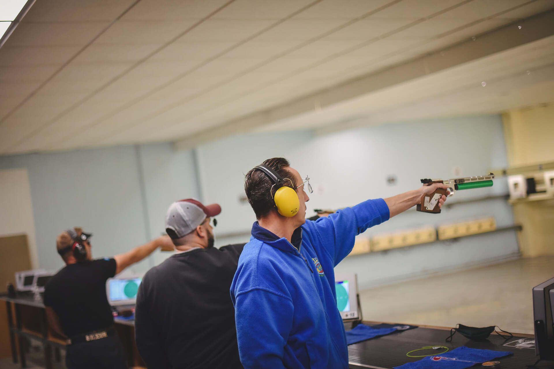 Con una pistola de calibre .22, se tira sobre 5 blancos diferentes de 50 cm de diámetro, divididos en zonas de puntuación de 5 a 10 puntos, y situados a 25 m en una galería al aire libre.